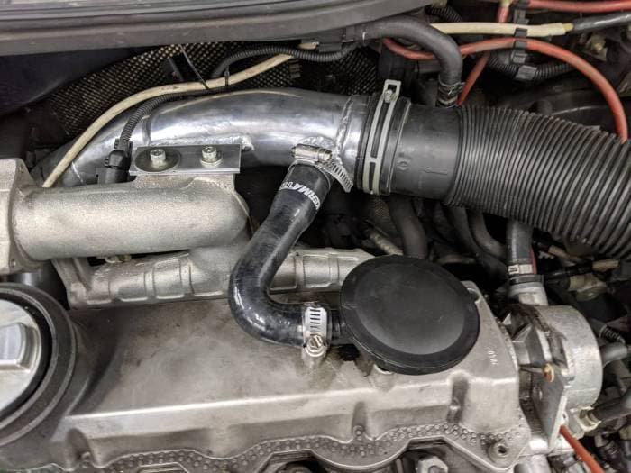This OMI intake pipe streamlines this twisted plastic mess that came from the factory and give the intake a tough sound to boot.